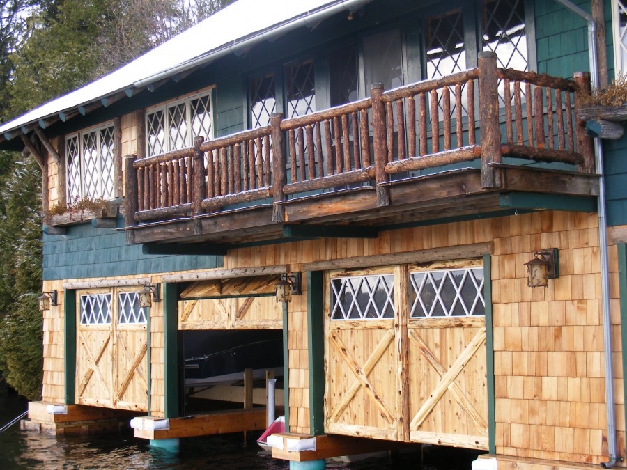This design was a collaboration between the owners and myself. This was the lady of the house's project and was a wonderful person to work with. FJ Fortune and Company were the general contractors on this extensive remodel. Matching the diamonds of the windows upstairs was important as well as maintaining the Adirondack look of the windows and upper railings of the decks. As seen in the photo above, these rustic Adirondack style doors presented many challenges and generated interesting solutions. The joints on these doors were carved using a small chain saw.