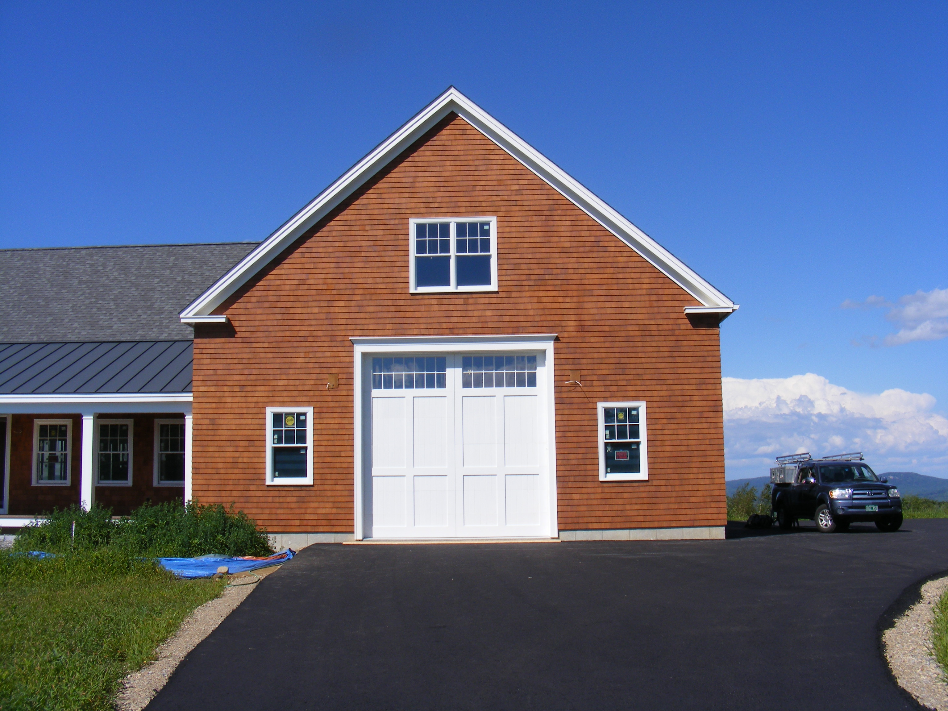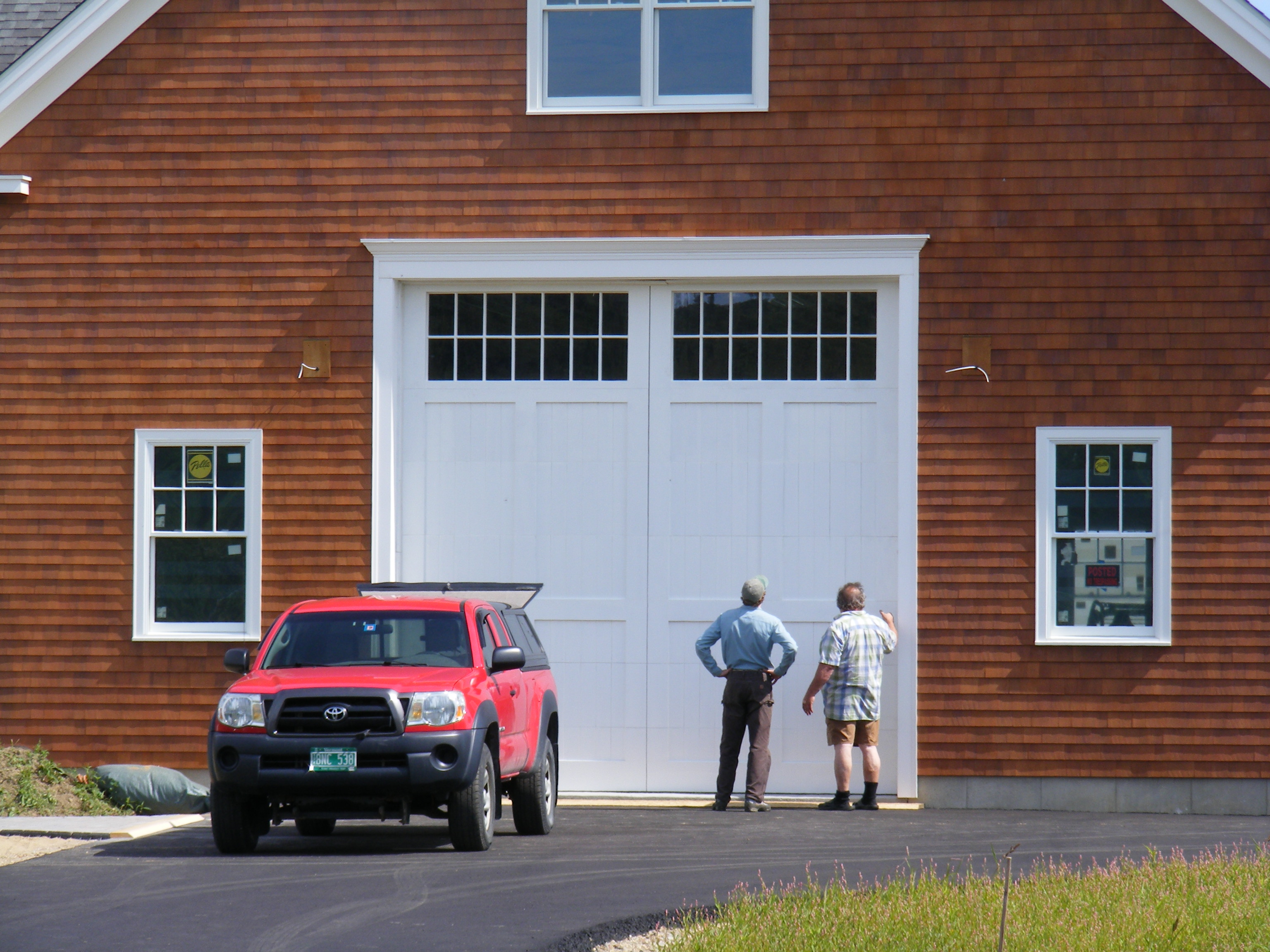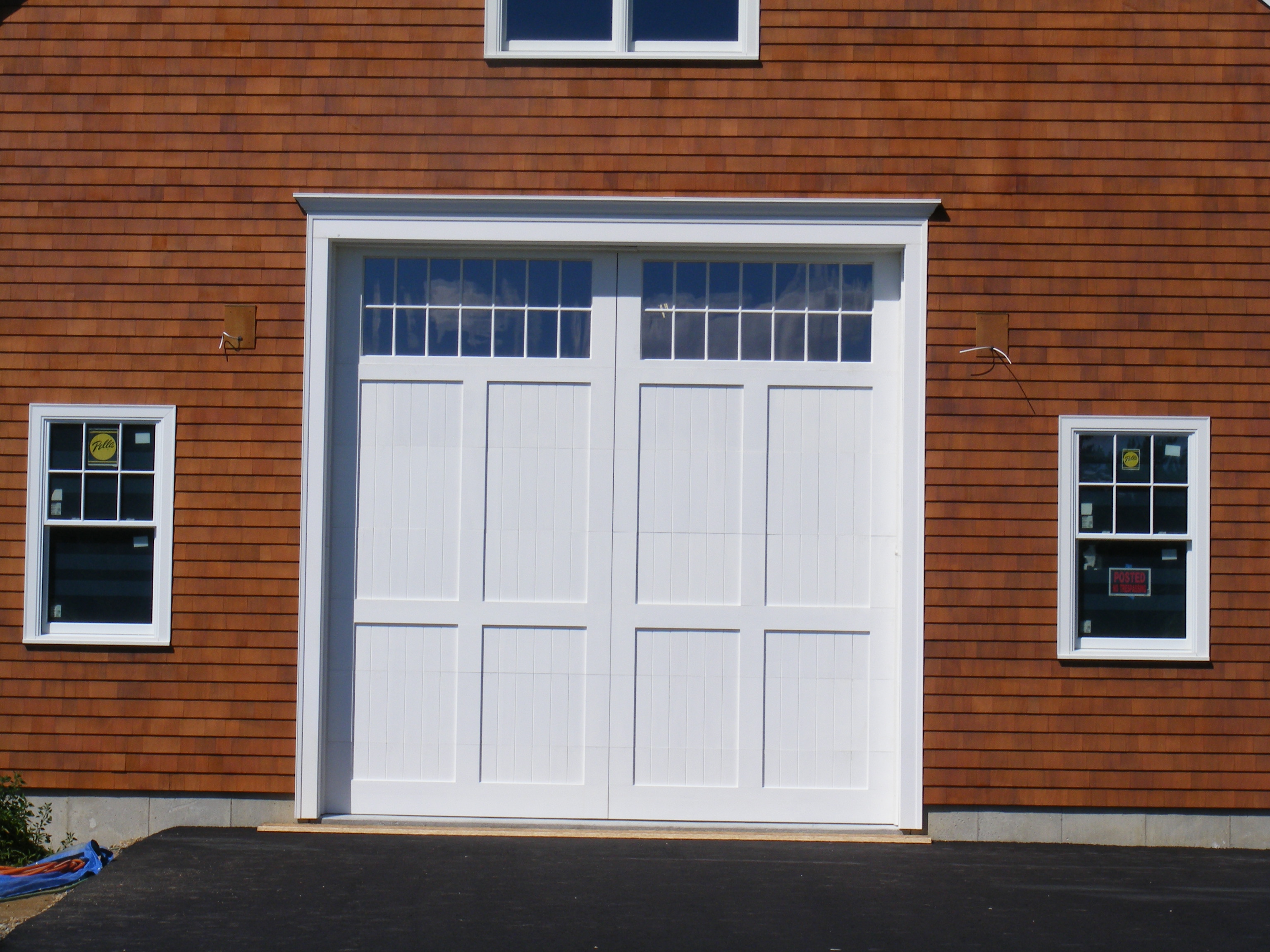 This was one monumental garage door! I was excited to use concepts tested in the large doors we had built in the past. The dimensions were 14' X 14', 3" thick, weighing in at 900 lbs. This was a chance to use a large, heavy 12’ wide by 3’ tall custom window section on top of enough solid sections to counter the weight, especially in Low Head Room track whose balance can be tricky if the entire door weight is not uniform.