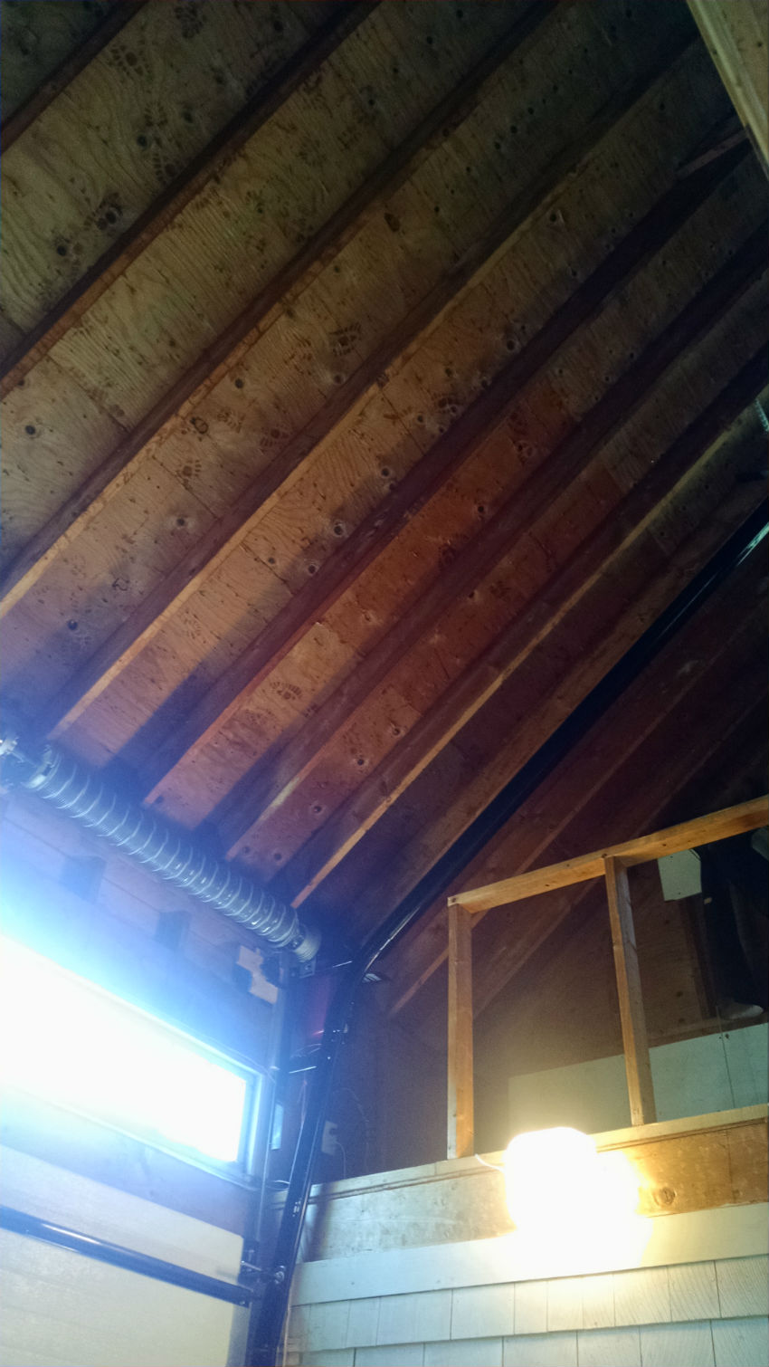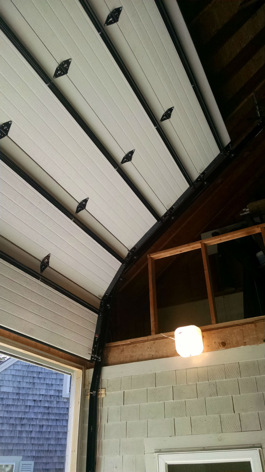 Another aspect to this job was that after a site visit and looking at track options we decided to go with a “High-Lift to Roof-line” track system. The normal 90 degree to horizontal track would have been in his way as the door opens directly into his shop and it would have interfered with access to his upper Mezzanine level. Also, there was a problem with side room on the Right side Looking Out (RTLO), there was none or very little, 2-1/4”, normal is 5-1/2”. We solved this problem by mounting the track directly to the wall using wood spacers to get the right off-set. Using the Hi-lift track system worked well, as the wall stopped at the second level in the barn.